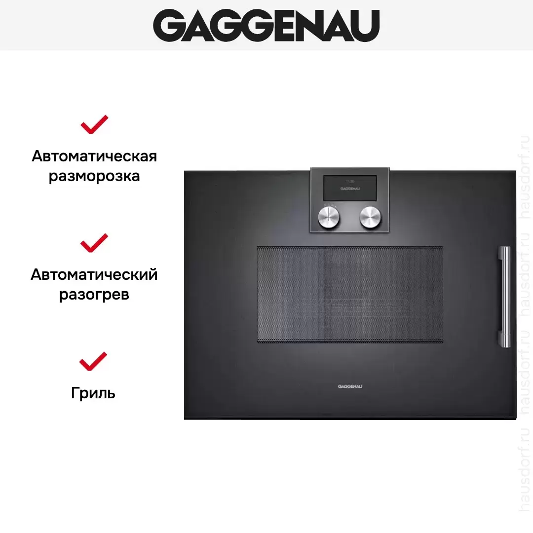 Количество режимов в данной модели Гаггенау: 4 шт. Для обработки продуктов и готовых блюд используются следующие виды нагрева: Микроволны, Гриль, Гриль + конвекция (обдув), Микроволны + гриль, Микроволны + конвекция (обдув). Выберите гриль, чтобы получить поджаристую корочку на мясе или рыбе. Тип гриля в этой микроволновке кварцевый. Конвекция способствует равномерную распространению горячего воздуха по всей камере, поэтому даже если блюдо большое, все его кусочки пропекаются одинаково. Если вы спешите, а еду нужно разогреть, используйте быстрый старт — благодаря ему 30 секунд прибор работает на полной мощности. Автоматические программы для приготовления добавлены производителем также для упрощения работы.
