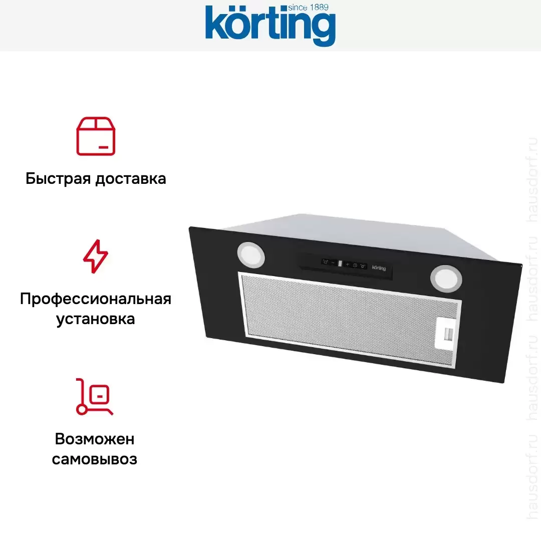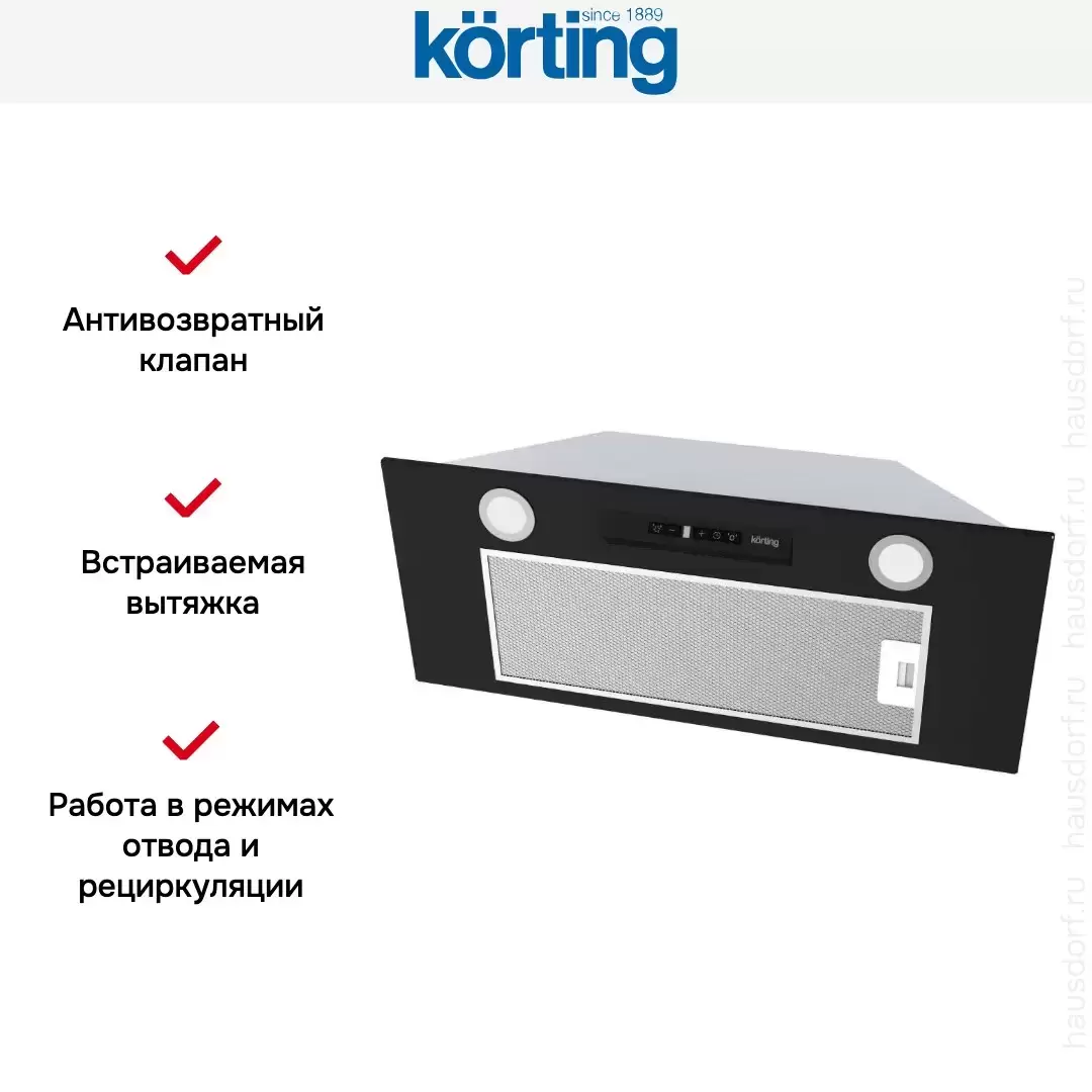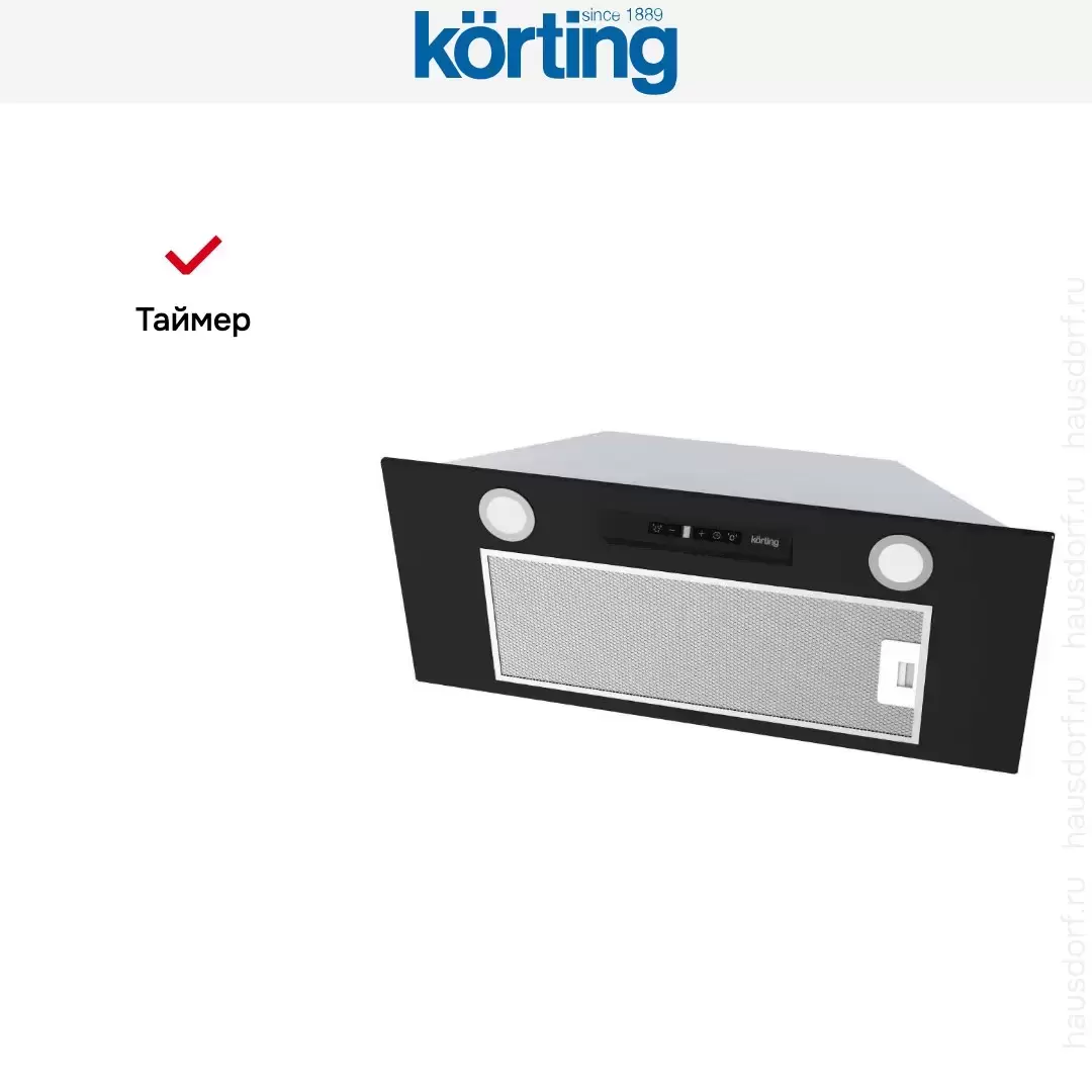 Встраиваемая вытяжка — выбор тех, кто хочет максимально задекорировать технику, или владельцев маленькой кухни. Тип встраивания: в шкаф. Обратите внимание на цветовые сочетания модели Korting KHI 9755 N, чтобы органично вписать ее в свою квартиру. Оттенок корпуса: черный. Благодаря лампочкам, которые расположены на нем, можно освещать плиту и столешницу рядом, чтобы готовить было еще проще и приятнее.