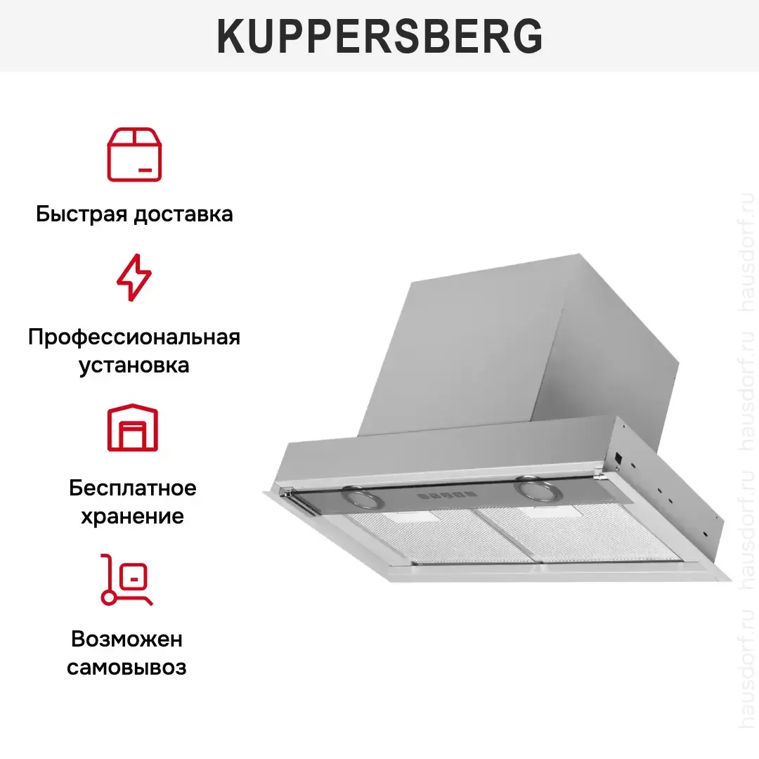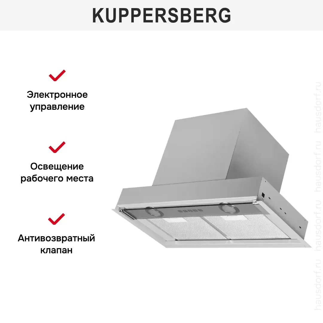 Встраиваемая вытяжка — выбор тех, кто хочет максимально задекорировать технику, или владельцев маленькой кухни. Тип встраивания: в шкаф. Обратите внимание на цветовые сочетания модели Kuppersberg FRANCESCA 60, чтобы органично вписать ее в свою квартиру. Оттенок корпуса: нержавеющая сталь. Благодаря лампочкам, которые расположены на нем, можно освещать плиту и столешницу рядом, чтобы готовить было еще проще и приятнее.