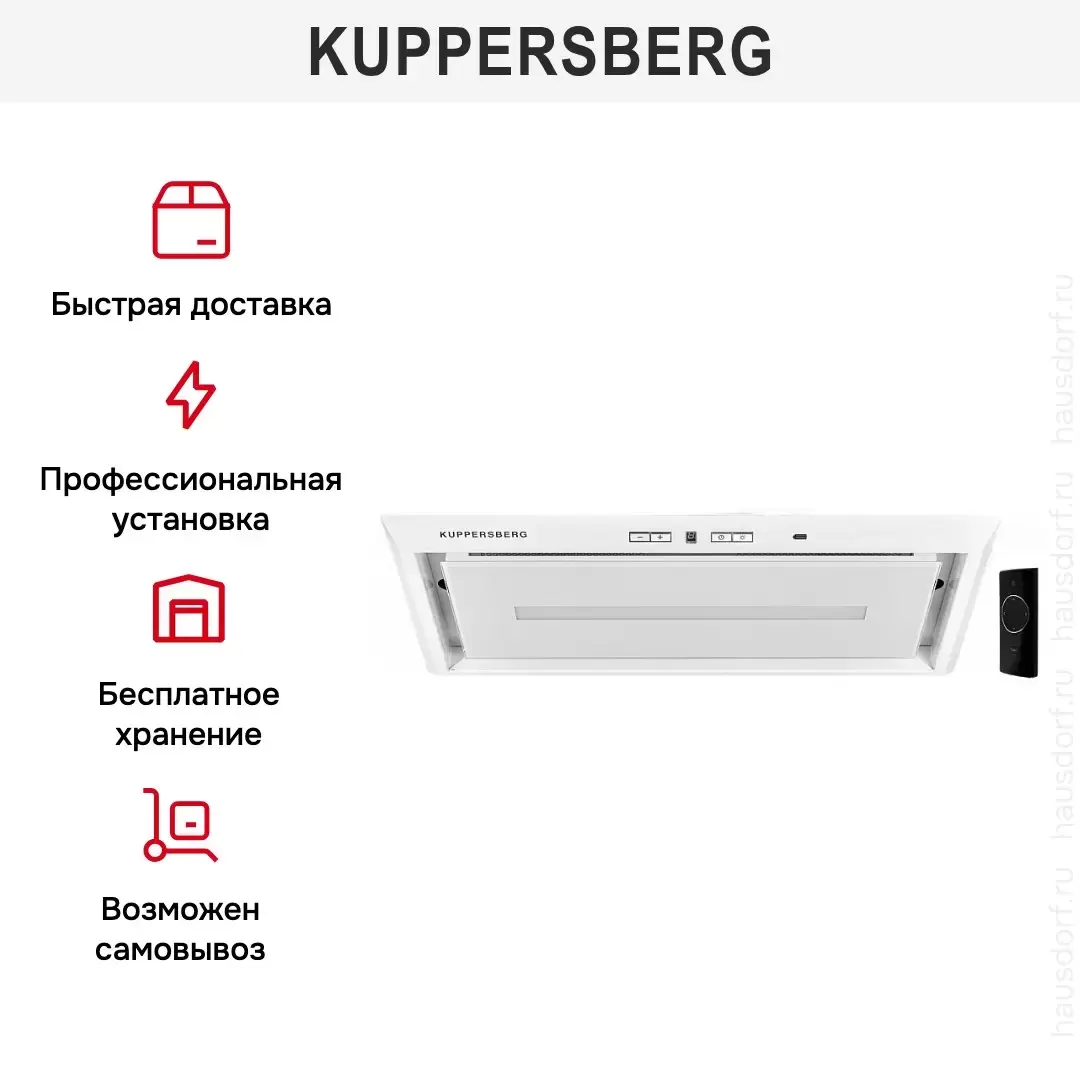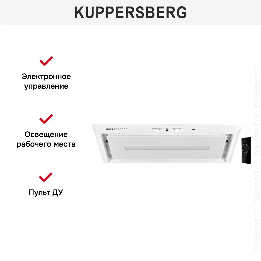 Встраиваемая вытяжка Kuppersberg INBOX 54 W наиболее универсальна и многофункциональна. Она сделана из современных материалов и обладает оптимальным соотношением цена/качество. Лучше всего подходит для кухонь площадью до 30 квадратных метров. Несмотря на светлый цвет, очень практична: покрытие не царапается и не темнеет. Если на вытяжку попал жир или частички пищи, ее очень просто очистить с помощью губки и любого чистящего средства.