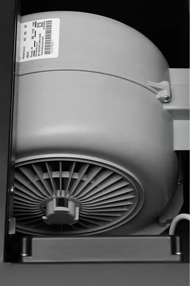 Вытяжка работает в режимах отвода и циркуляции, поэтому загрязнения удаляются из комнаты и перенаправляются в воздуховод, при этом можно очистить воздух и использовать повторно за счет возвращения его в помещение. Количество скоростей в этой модели: 3 шт. При этом максимальная производительность составляет 850 куб.м./ч. Уровень шума при полной загруженности — 42 дБ.