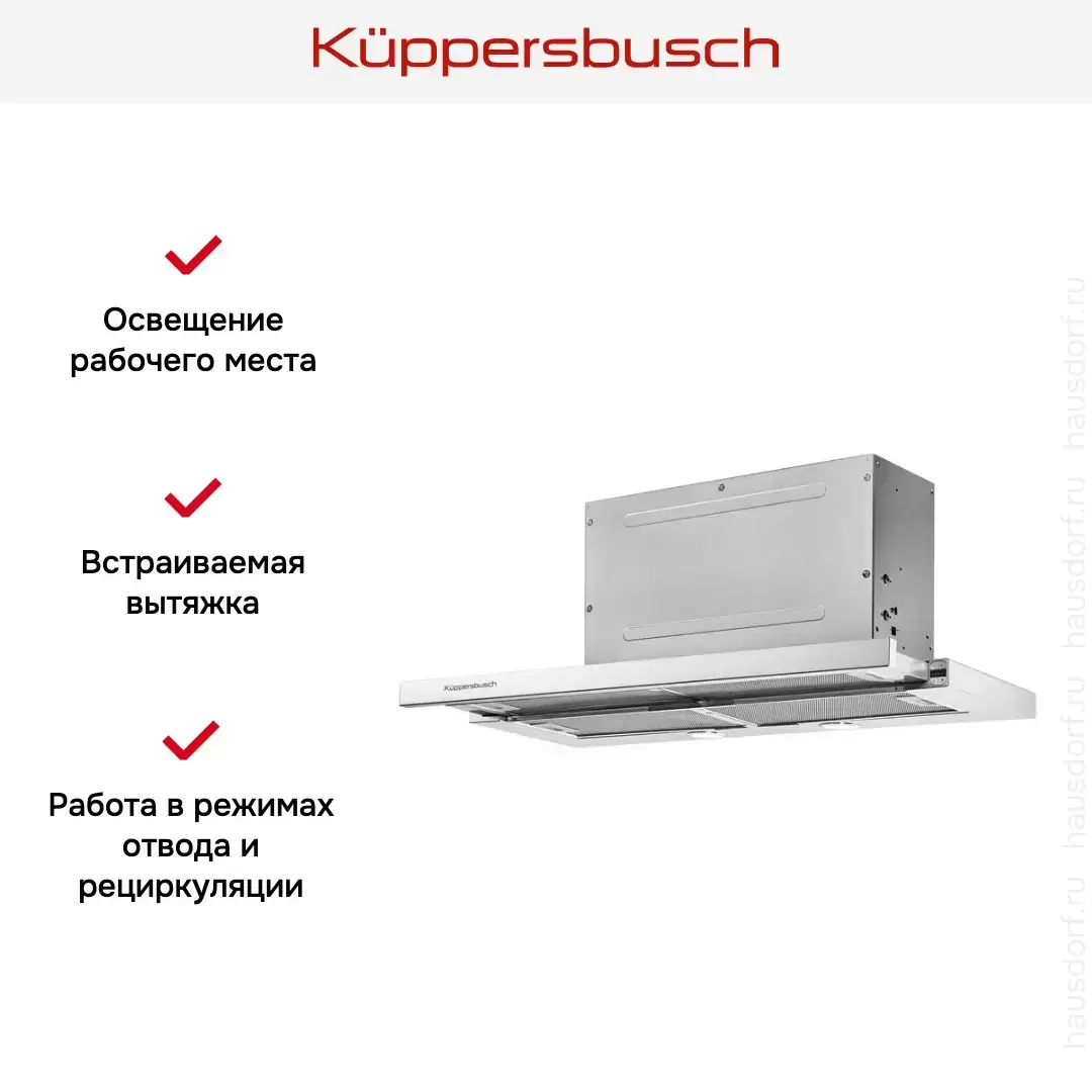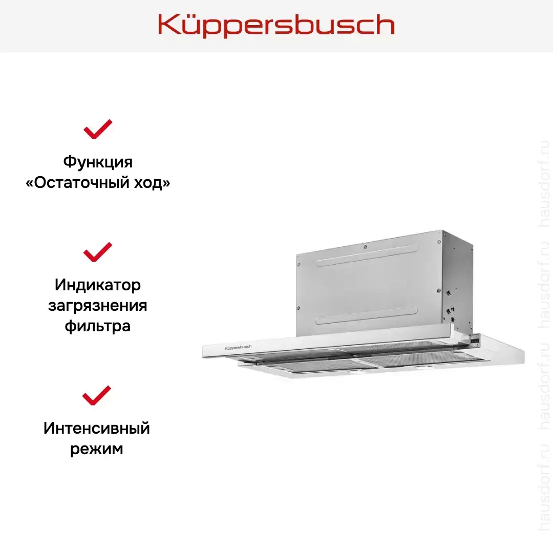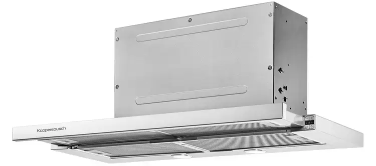 Встраиваемая вытяжка Kuppersbusch DEF 9550.0 E имеет выдвижную стеклянную панель, которая способствует увеличению площади аспирации. Модель работает в режиме отвода воздуха, но также возможна установка режима рециркуляции. В комплекте с вытяжкой идет металлический фильтр. Индикация загрязнения вовремя сообщит о необходимости его замены или очистки. 4 уровня мощности расширяют возможности использования прибора. Интенсивный режим за короткий промежуток времени очистит помещение от неприятных запахов и дыма. Среди дополнительных преимуществ: