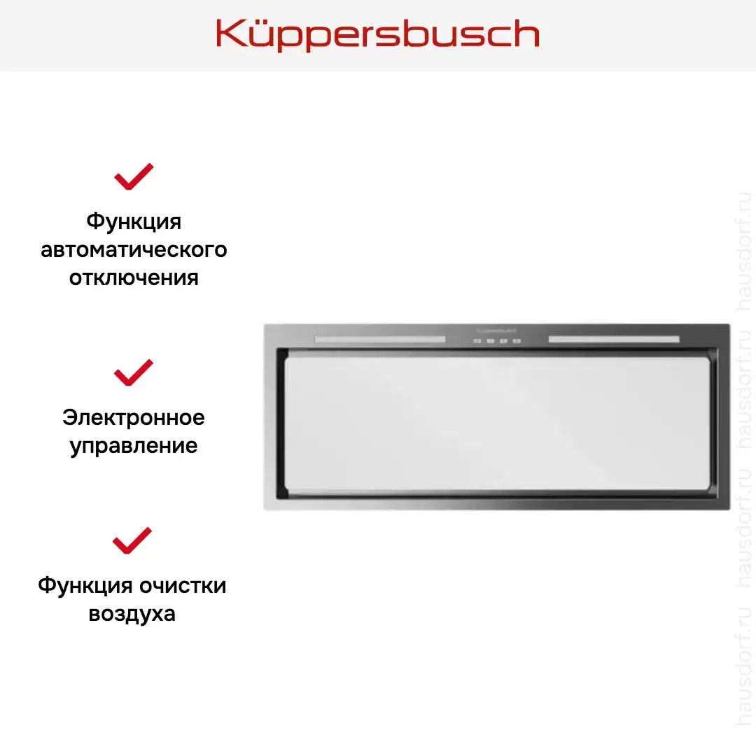 Встраиваемая вытяжка — выбор тех, кто хочет максимально задекорировать технику, или владельцев маленькой кухни. Тип встраивания: в шкаф. Обратите внимание на цветовые сочетания модели Kuppersbusch DEL 8550.0 W, чтобы органично вписать ее в свою квартиру. Оттенок корпуса: нержавеющая сталь/белое стекло. Благодаря лампочкам, которые расположены на нем, можно освещать плиту и столешницу рядом, чтобы готовить было еще проще и приятнее.
