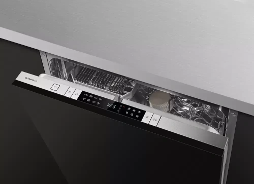 Управление осуществляется с помощью электронной панели с цифровым дисплеем и функцией Touch Control. На ней находятся индикаторы наличия ополаскивателя и соли, а также индикатор оставшегося времени. После окончания звучит сигнал, а на полу появляется специальный луч, информирующий о завершении работы. Предусмотрен таймер отсрочки запуска от 1 до 24 часов, что позволяет запланировать процесс мойки в удобное для вас время.
