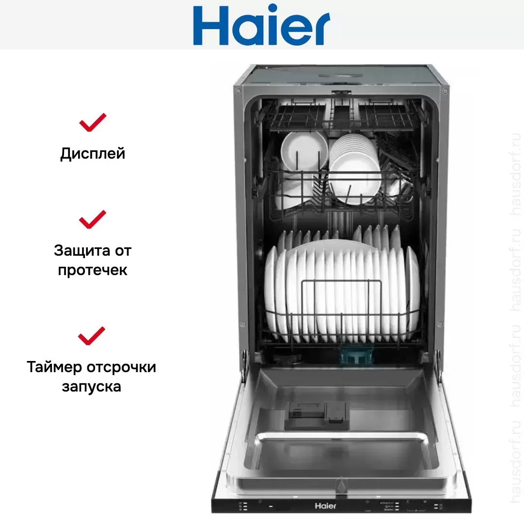 Встраиваемая модель Хайер отлично впишется в любой интерьер, главное — правильно выбрать место, чтобы подвести коммуникации. Устанавливается в нишу целиком, полностью закрывается декоративной панелью. Обратите внимание: в комплекте не идет фасад, его необходимо установить самостоятельно. Имеет уменьшенную ширину — благодаря этому поместится даже на очень маленькой кухне. В камеру можно загрузить ограниченное число комплектов: 10 шт. Комплектом считается набор посуды на одного человека, который нужен для полноценного приема пищи: глубокая и плоская тарелки, тарелка для салата, блюдце под чашку, сама чашка, ложка и вилка.