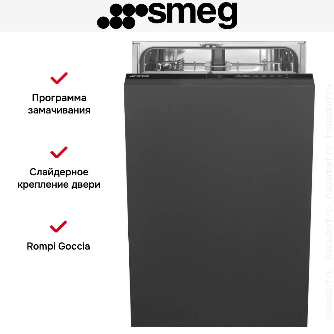 Встраиваемая посудомоечная машина Smeg ST4512IN — узкая модель шириной 45 см для установки в малогабаритной кухне. Она рассчитана на одновременную мойку 9 комплектов посуды — в каждый комплект входят глубокая и мелкая тарелки, салатник, чашка с блюдцем, вилка и ложка. На фронтальную часть машины может быть установлен мебельный фасад весом не более 7,5 кг на скользящих петлях. Рабочая камера и фильтр изготовлены из нержавеющей стали, а дверца — из оцинкованной стали. Для защиты от протечек в посудомоечной машине Смег ST4512IN предусмотрена система «полный Aquastop». Имеется возможность подключения к горячей воде — экономия электроэнергии при этом может составить до 35%.