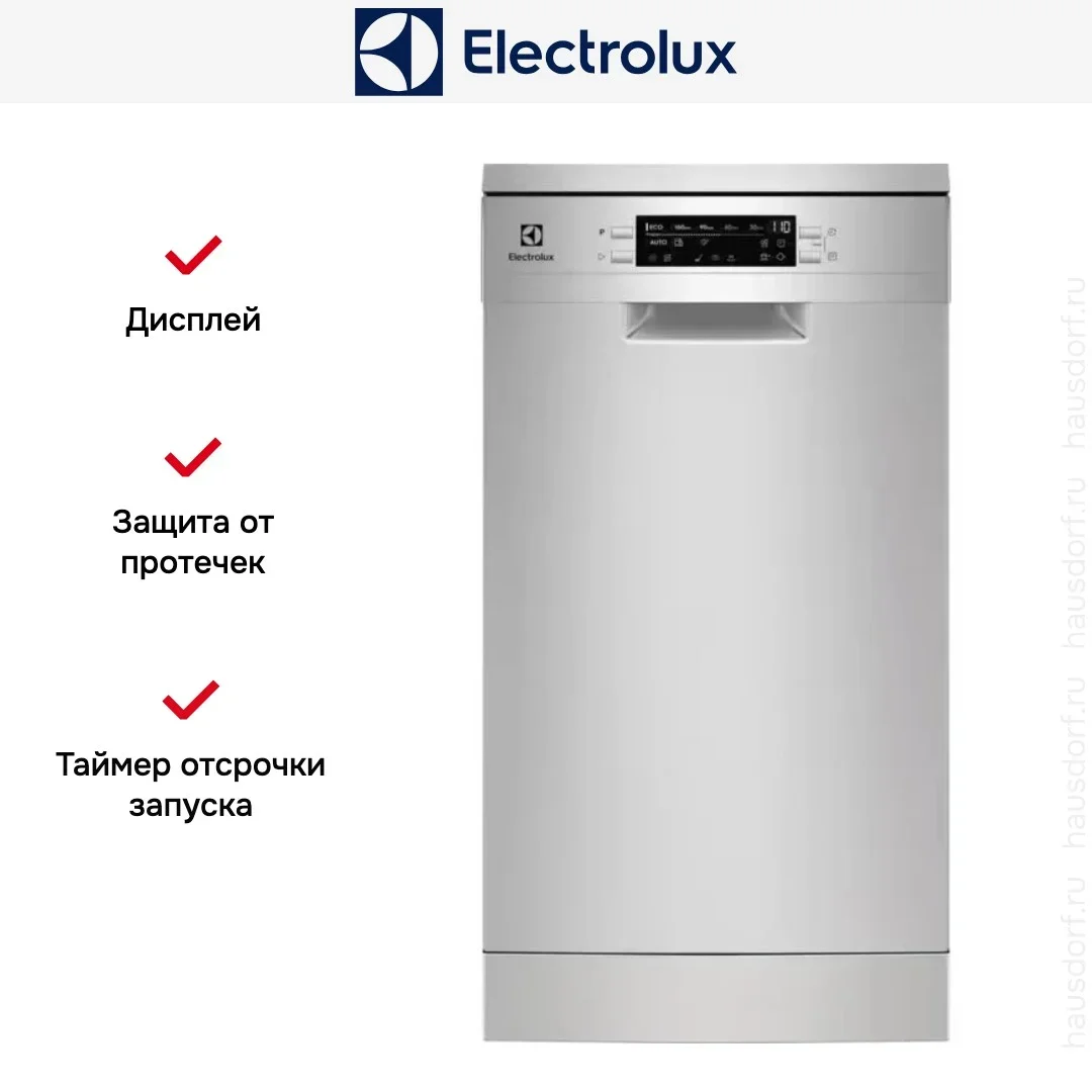 Отдельностоящая модель Электролюкс отлично впишется в кухонный интерьер, главное — правильно выбрать место, чтобы подвести коммуникации. Имеет уменьшенную ширину — благодаря этому поместится даже на очень маленькой кухне. В камеру можно загрузить ограниченное число комплектов. Комплектом считается набор посуды на одного человека, который нужен для полноценного приема пищи: глубокая и плоская тарелки, тарелка для салата, блюдце под чашку, сама чашка, ложка и вилка.