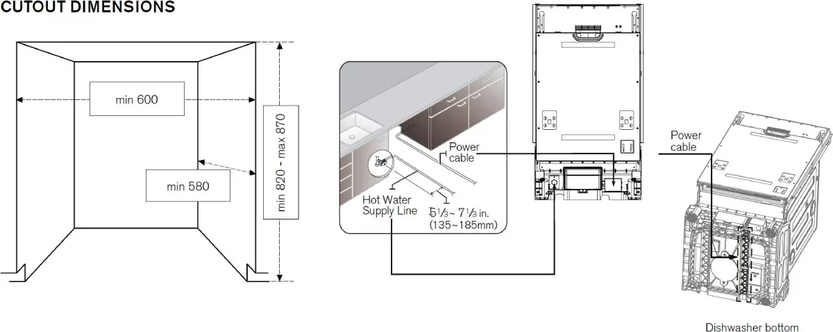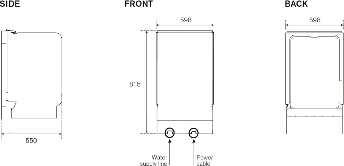 Габариты корпуса — 81,5 × 59,8 × 55 см — позволяют разместить устройство в стандартной нише размером 87 × 60 × 58 см, обеспечивая плотное прилегание, устойчивость и свободный доступ к дверце. Продуманная внутренняя организация с регулируемыми корзинами и складными держателями даёт возможность разместить даже габаритные предметы — от кастрюль и противней до бокалов и столовых приборов — без компромиссов в удобстве и эффективности мойки.