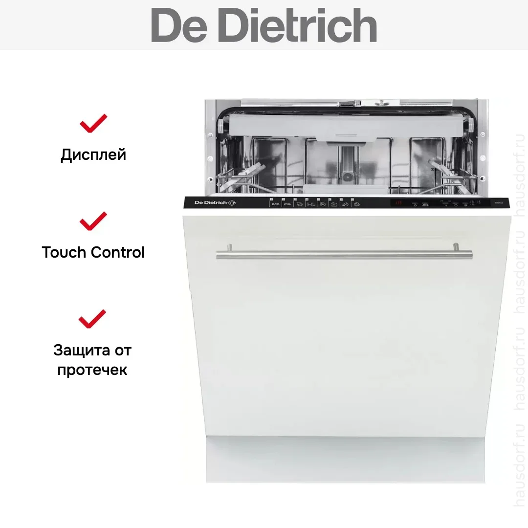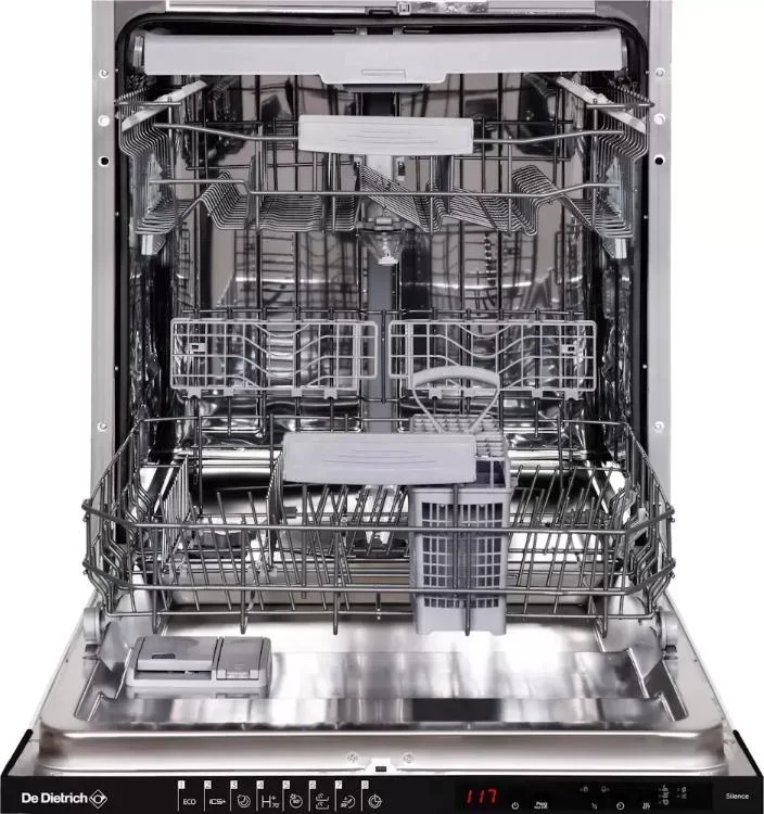Посудомоечная машина De Dietrich DV1434QJ создана для полного встраивания в кухонный гарнитур и сохраняет единый стиль с фасадами. Ее лаконичный внешний вид позволяет скрыть технику за вашей дверцей, а черная панель управления остается незаметной благодаря закрытой конструкции. Габариты адаптированы к стандартным нишам 82×60×58 см, что упрощает монтаж в типовой кухонный модуль. Высота регулируется в пределах 81.8-86.8 см, а компактная глубина 55 см экономит пространство, не жертвуя вместимостью.