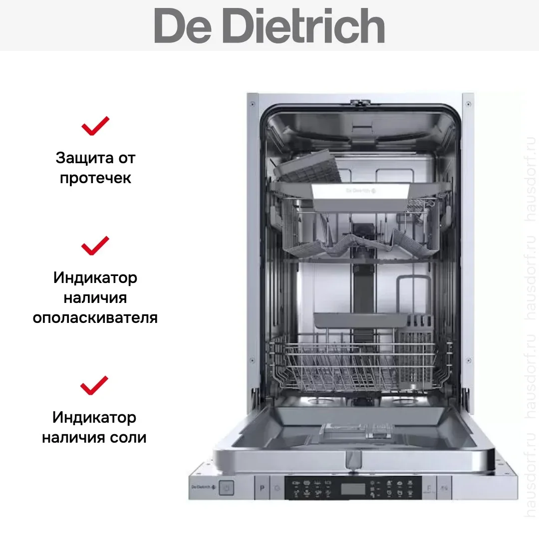 Встраиваемая модель Де Дитрих отлично впишется в любой интерьер, главное — правильно выбрать место, чтобы подвести коммуникации. Устанавливается в нишу целиком, полностью закрывается декоративной панелью. Обратите внимание: в комплекте не идет фасад, его необходимо установить самостоятельно. Имеет уменьшенную ширину — благодаря этому поместится даже на очень маленькой кухне. В камеру можно загрузить ограниченное число комплектов: 10 шт. Комплектом считается набор посуды на одного человека, который нужен для полноценного приема пищи: глубокая и плоская тарелки, тарелка для салата, блюдце под чашку, сама чашка, ложка и вилка.