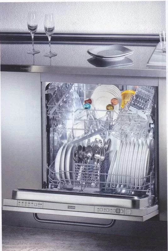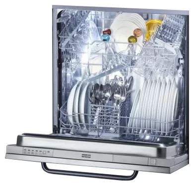 Встраиваемая модель Франке отлично впишется в любой интерьер, главное — правильно выбрать место, чтобы подвести коммуникации. Устанавливается в нишу целиком, полностью закрывается декоративной панелью. Обратите внимание: в комплекте не идет фасад, его необходимо установить самостоятельно. Имеет стандартные размеры, поэтому может не поместиться на очень маленькой кухне. В камеру можно загрузить ограниченное число комплектов: 13 шт. Комплектом считается набор посуды на одного человека, который нужен для полноценного приема пищи: глубокая и плоская тарелки, тарелка для салата, блюдце под чашку, сама чашка, ложка и вилка.