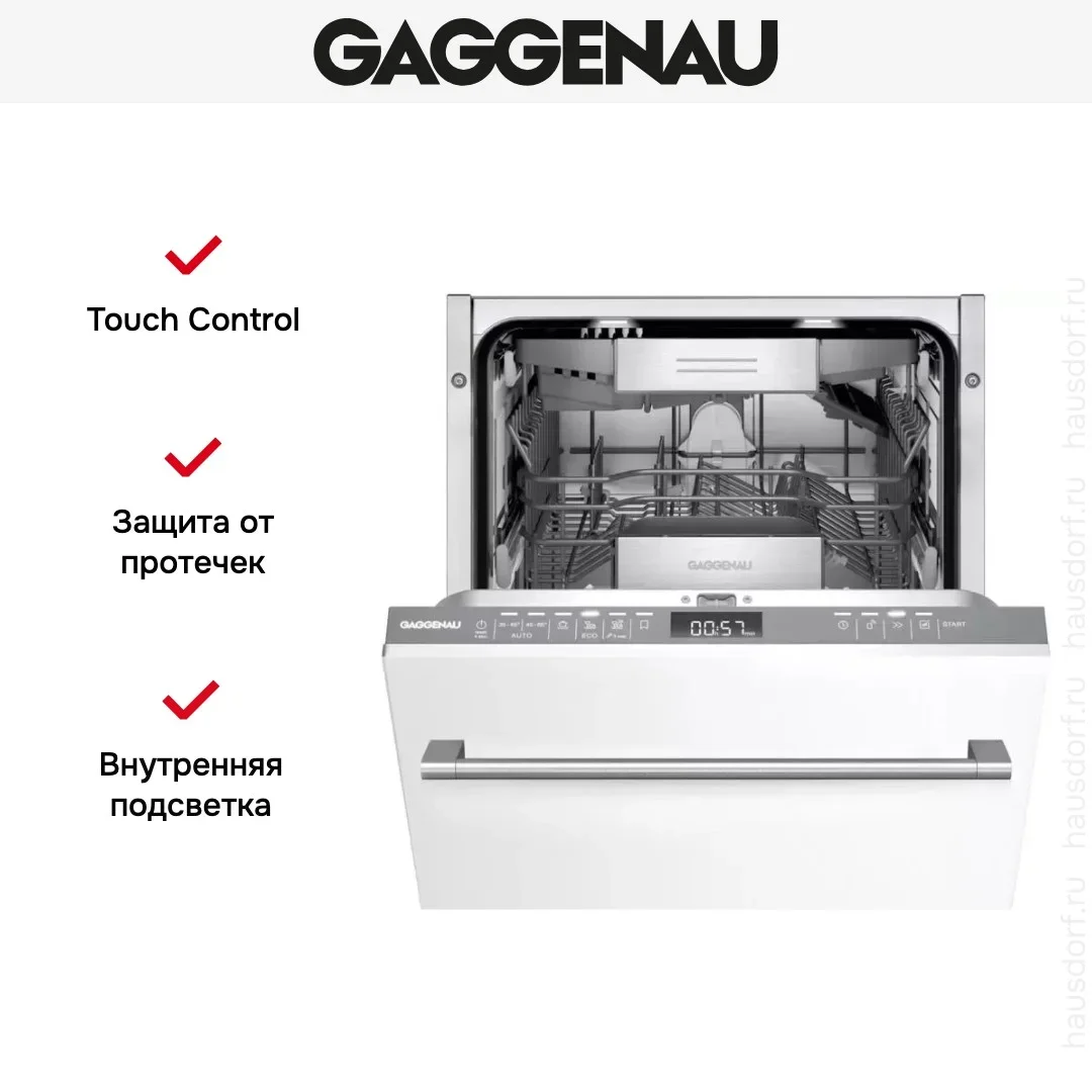 Встраиваемая модель Гаггенау отлично впишется в любой интерьер, главное — правильно выбрать место, чтобы подвести коммуникации. Устанавливается в нишу целиком, полностью закрывается декоративной панелью. Обратите внимание: в комплекте не идет фасад, его необходимо установить самостоятельно. Имеет уменьшенную ширину — благодаря этому поместится даже на очень маленькой кухне. В камеру можно загрузить ограниченное число комплектов: 10 шт. Комплектом считается набор посуды на одного человека, который нужен для полноценного приема пищи: глубокая и плоская тарелки, тарелка для салата, блюдце под чашку, сама чашка, ложка и вилка.