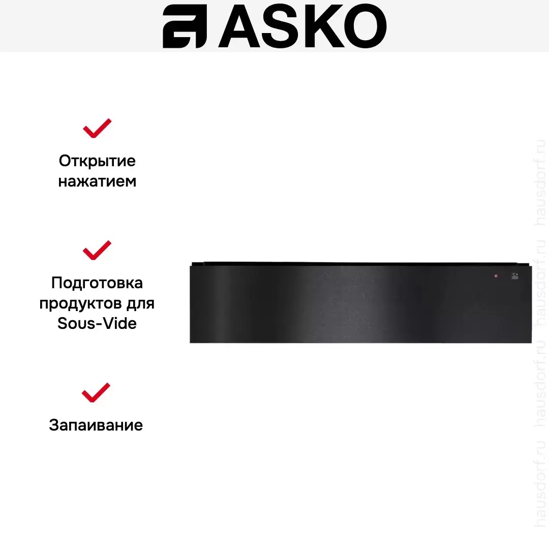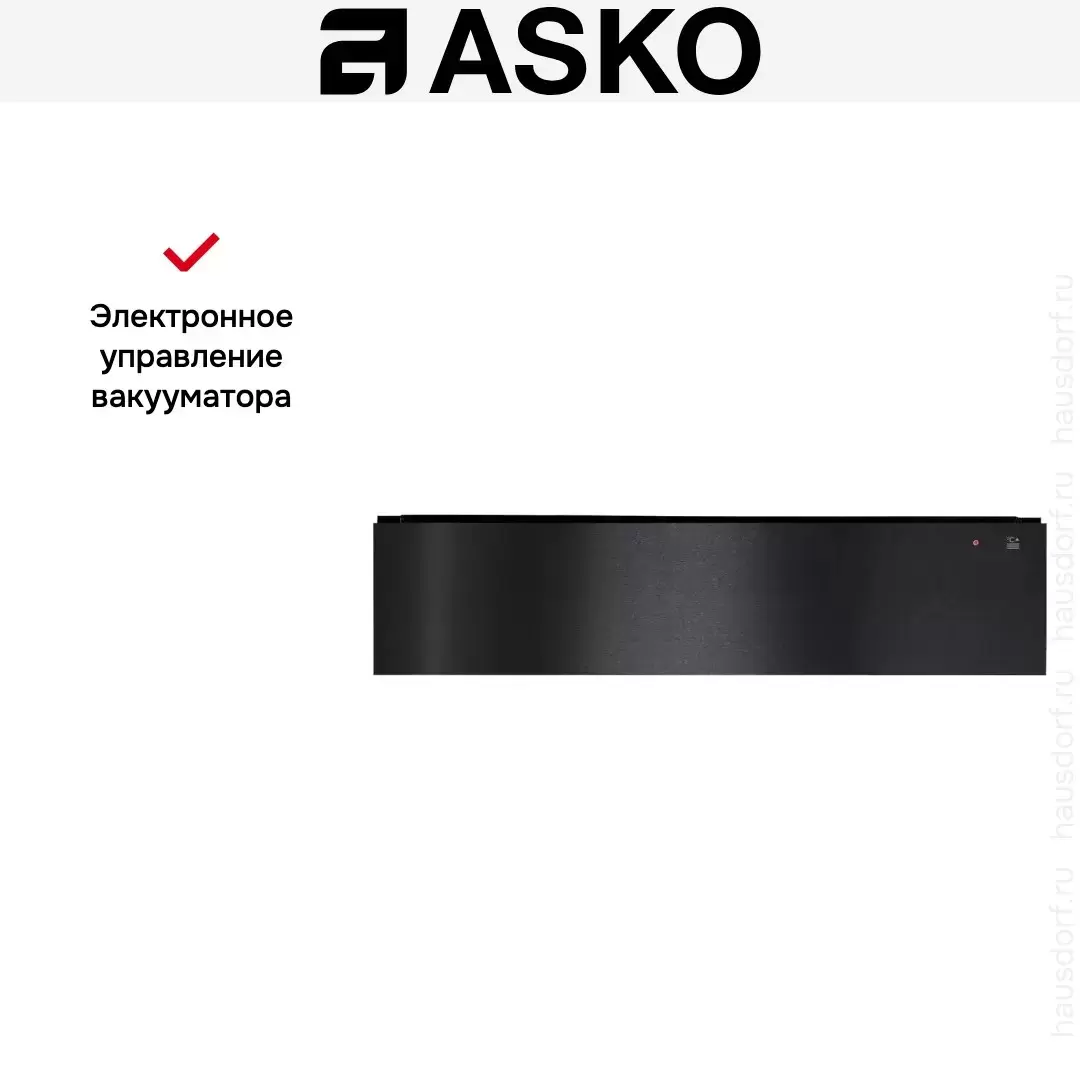 Вакуумный упаковщик Asko с нажимным механизмом открывания. Модель оснащена сенсорным управлением и телескопическими направляющими, которые позволяют выдвигать ящик на всю глубину. Прибор из серии Craft высотой 15 см можно встроить в колонну с другой домашней техникой. Объем вакуумной камеры равен 8 литров, максимальный размер пакета для запаивания составляет 250×350 см. В зависимости от типа продуктов можно выбрать одну из 3 степеней вакуумирования. В числе режимов работы устройства — подготовка продуктов для приготовления в режиме Sous-vide при низкой температуре, вакуумирование твердых и жидких продуктов и обычная запайка пакетов. Может использоваться также для маринования мяса или рыбы. Ящик изготовлен из нержавеющей стали и устойчив к изменениям температуры.