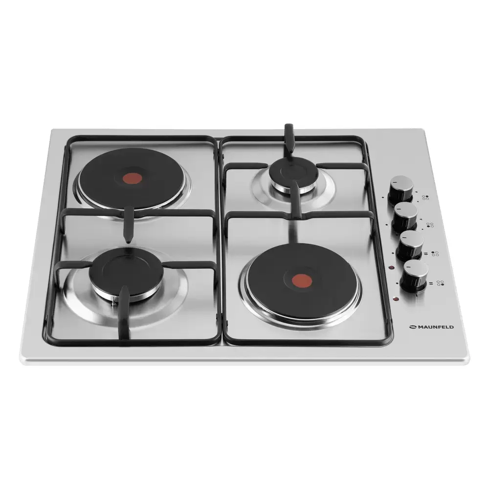 Maunfeld EEHS.64.5ES/KG — независимая комбинированная варочная панель шириной 60 см с 2 газовыми и 2 электрическими конфорками. Поверхность изготовлена из черной эмалированной стали, легкой в очистке. Правая задняя и левая передняя газовые горелки SABAF снабжены электроподжигом и функцией «газ-контроль» для предотвращения утечек газа. Черная раздельная решетка выполнена из эмалированного металла. Чугунные конфорки HP RAPID мощностью по 1500 Вт гарантируют быстрый нагрев. Боковая механическая панель управления оснащена поворотными переключателями с не нагревающимися ручками.