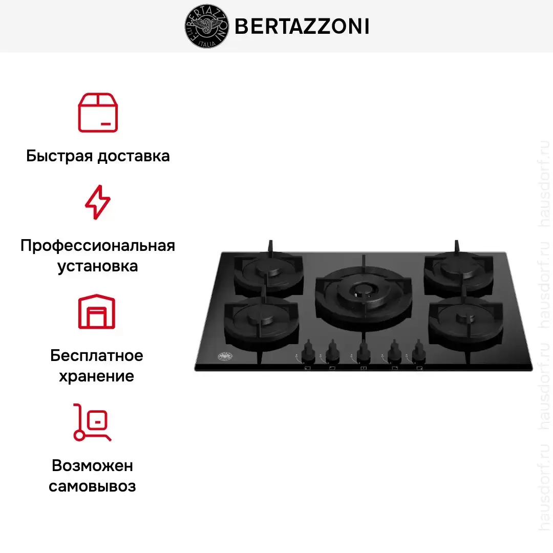 Bertazzoni P755CMODGNE — газовая варочная панель из черного закаленного стекла. Отличается лаконичным стильным дизайном, который обеспечивают мягкие на ощупь рукоятки управления и моноблочные матовые конфорки. С помощью автоматического поджига можно включить прибор одним касанием. Благодаря функции газ-контроля эксплуатация полностью безопасна.