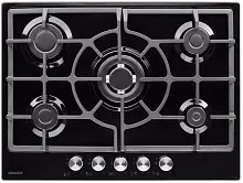 Выбор газовой варочной панели чаще всего обусловлен тем, что в частный дом или квартиру проведен именно газ в качестве обогрева. Работать с этой моделью довольно просто, так как мощность нагрева видна невооруженным взглядом — по силе огня в горелке. Количество конфорок в этой модели: 5. Горелки с двойной короной позволяют увеличивать мощность нагрева в зависимости от диаметра посуды.