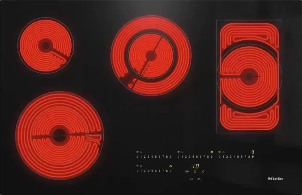 Варочная панель Miele, встраиваемая заподлицо. Предусмотрено 4 конфорки HiLight с автоматикой закипания, две — с кольцевой и одна — с прямоугольной зоной расширения.