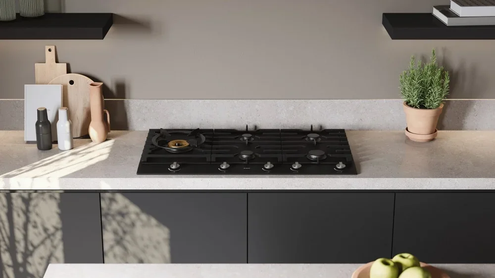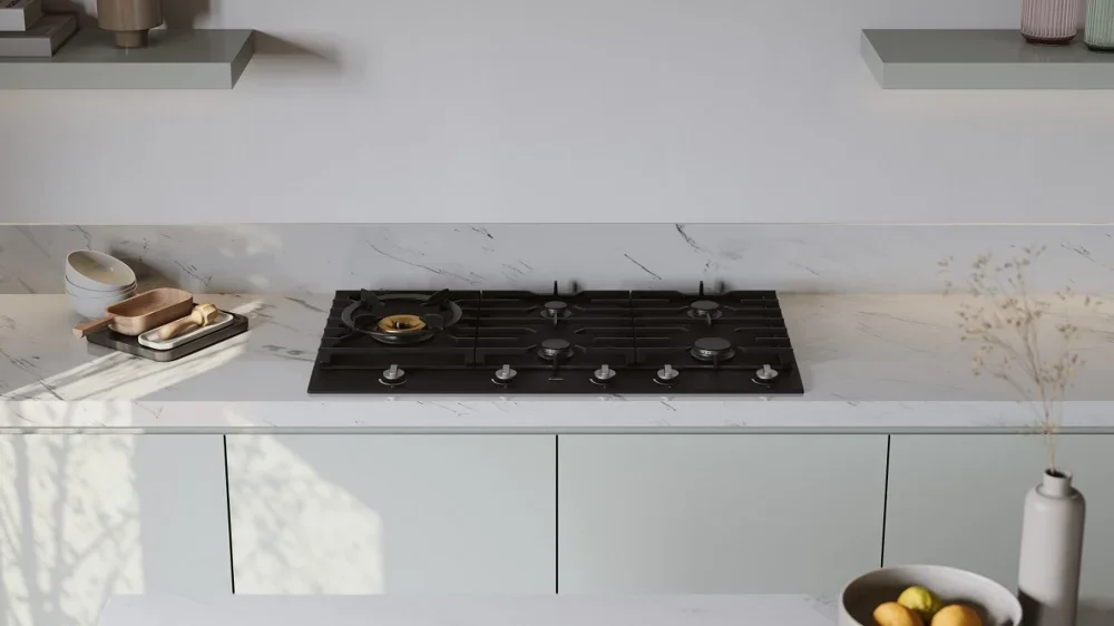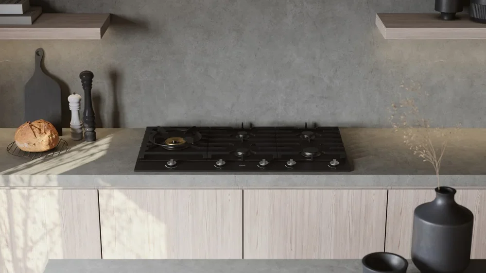 Модель шириной 90 см можно установить в просторной кухне. Слева на поверхности располагается уникальная конфорка Super Vario Wok с двумя радиусами пламени и косым направлением нагрева для лучшего охвата дна посуды. 4 гибридные конфорки А+ приподняты над поверхностью, что обеспечивает лучшую подачу воздуха для эффективного нагрева. Механическая панель управления позволяет плавно регулировать интенсивность пламени. Поворотные регуляторы не нагреваются во время работы. Конфорки из материала Keradur очень удобны в очистке. Для подключения к баллонному газу в комплект входят форсунки.