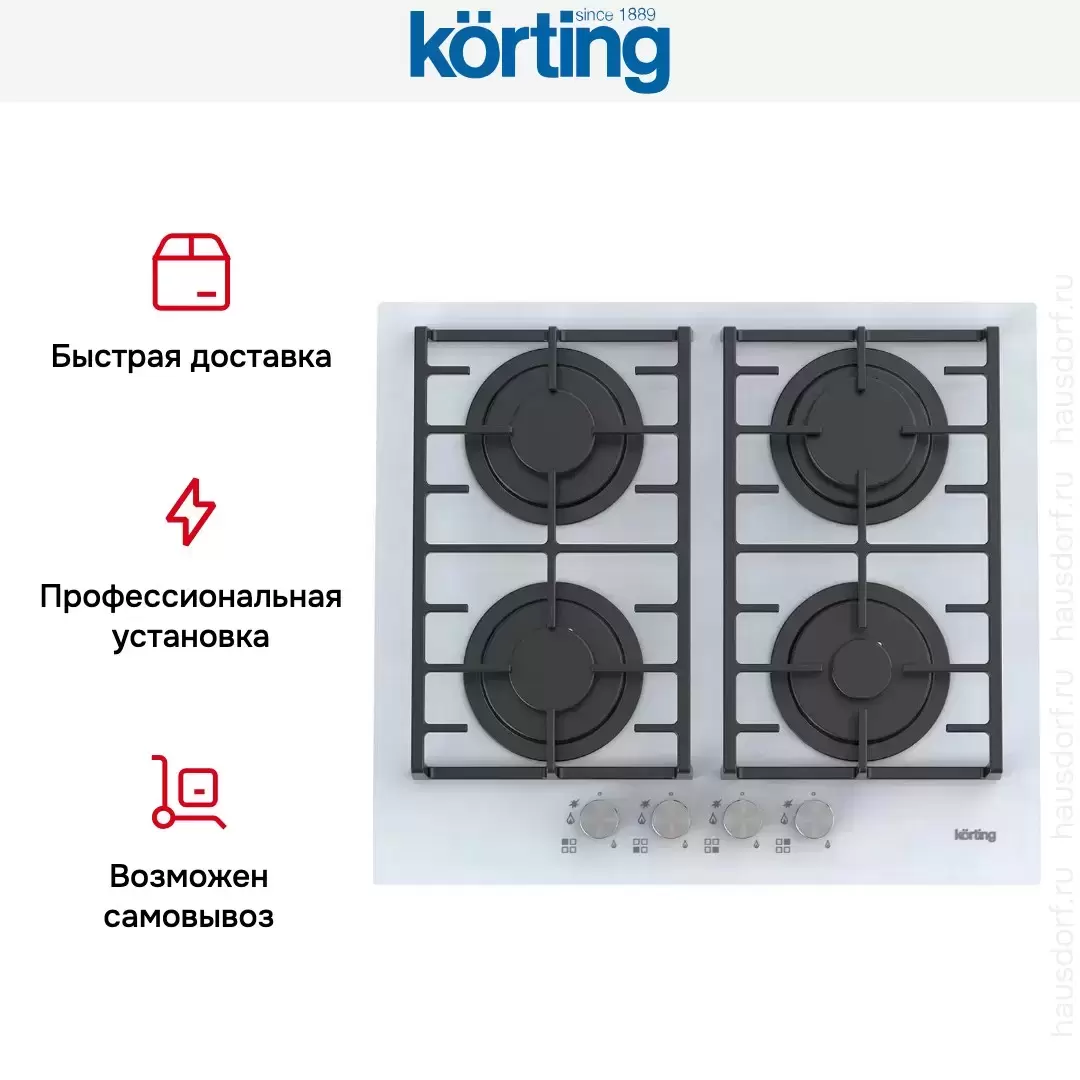 На фронтальной части находится механическая панель управления с поворотными переключателями цвета нержавеющей стали с металлическими рукоятками. С их помощью производится бесступенчатая регулировка интенсивности пламени. Включить конфорку при помощи электроподжига можно одним поворотом переключателя. Варочная панель имеет систему защиты от утечек газа «Газ-контроль». Раздельные чугунные решетки для размещения посуды пригодны для мытья в посудомоечной машине. Варочная панель Кортинг HGG 6805 CW может подключаться к газу в баллонах при помощи форсунок—они также входят в комплект.