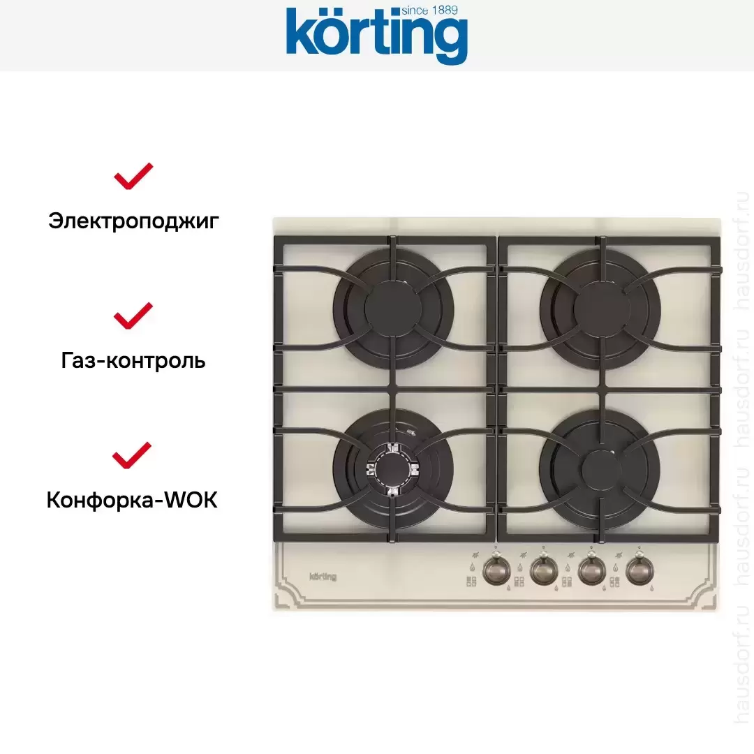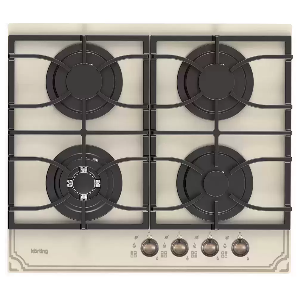 Korting HGG 6911 CTRB — варочная поверхность «газ на стекле» шириной 60 см. Модель в современном стиле с четырьмя конфорками монтируется в кухонную столешницу. Стекло теплого бежевого цвета дополняет стильная бронзовая фурнитура. Для включения конфорок не требуются спички или зажигалки — при повороте и нажатии на рукоятку переключателя срабатывает электроподжиг. Посуда устанавливается над горелкой на раздельной чугунной решетке необычной формы, которую можно мыть в посудомоечной машине.