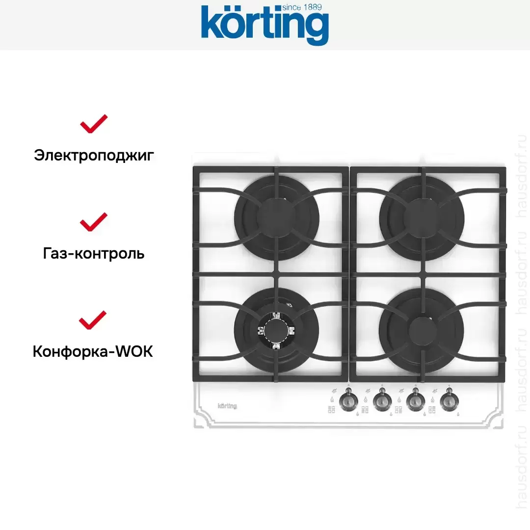 В первом ряду слева находится конфорка WOK для приготовления блюд восточной кухни с несколькими контурами пламени, которые способствуют равномерному распределению тепла по дну посуды. Механическая панель управления расположена справа, на расстоянии от этой конфорки, так что риск ожоги снижается до минимума. Кроме того, на варочной панели расположены две средние конфорки и одна вспомогательная маломощная. Рукоятки переключателей выполнены из металла, их температура не повышается, когда конфорки включены. Варочная панель Кортинг HGG 6911 CTRW оснащена системой «Газ-контроль», останавливающей поступление газа при случайном угасании пламени.