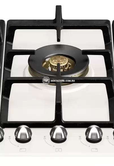 Варочная панель с газовым нагревом подойдет классической и современной кухне. Поверхность сделана из эмалированной стали цвета слоновой кости, поворотные переключатели на фронтальном крае хромированные. Латунные горелки имеют разную мощность: центральная WOK с двумя рядами пламени, две стандартных, одна быстрая и одна вспомогательная. Зажигать пламя можно одним движением благодаря автоматической системе.