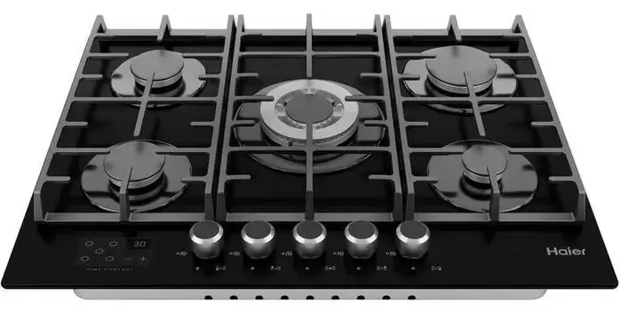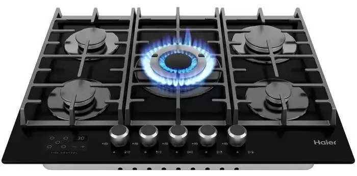 Выбор газовой варочной панели чаще всего обусловлен тем, что в частный дом или квартиру проведен именно газ в качестве обогрева. Работать с этой моделью довольно просто, так как мощность нагрева видна невооруженным взглядом — по силе огня в горелке. Количество конфорок в этой модели: 5. Горелки с двойной короной позволяют увеличивать мощность нагрева в зависимости от диаметра посуды.