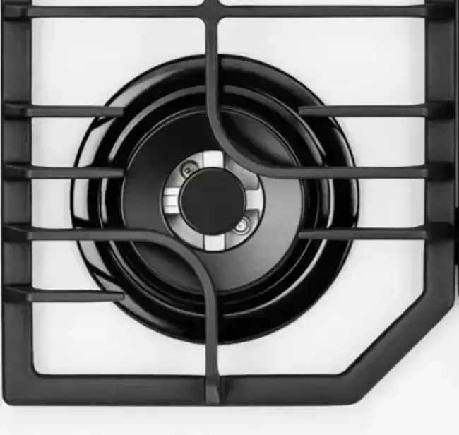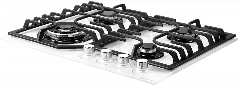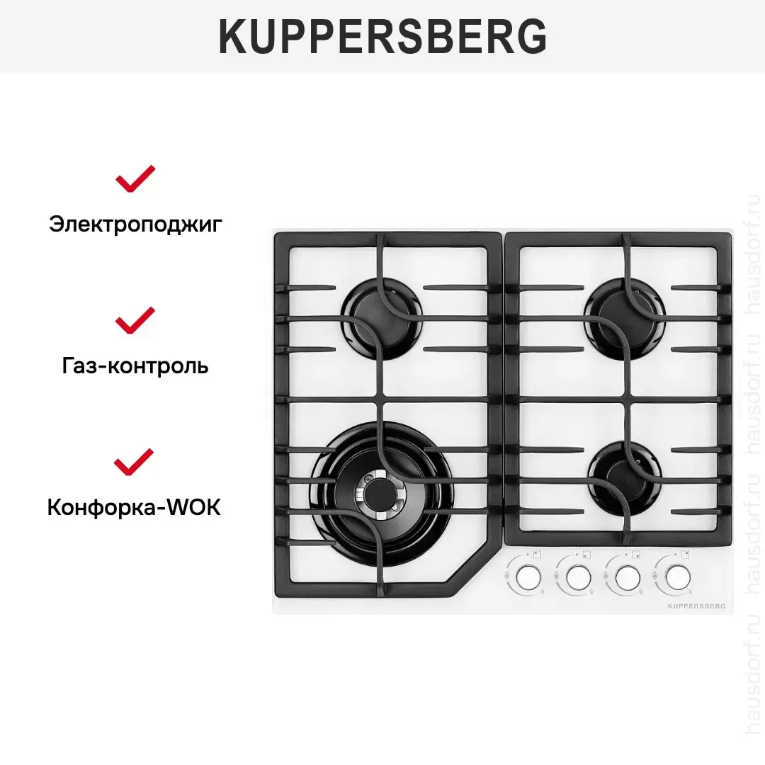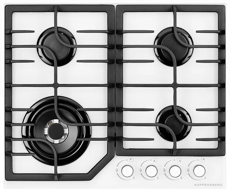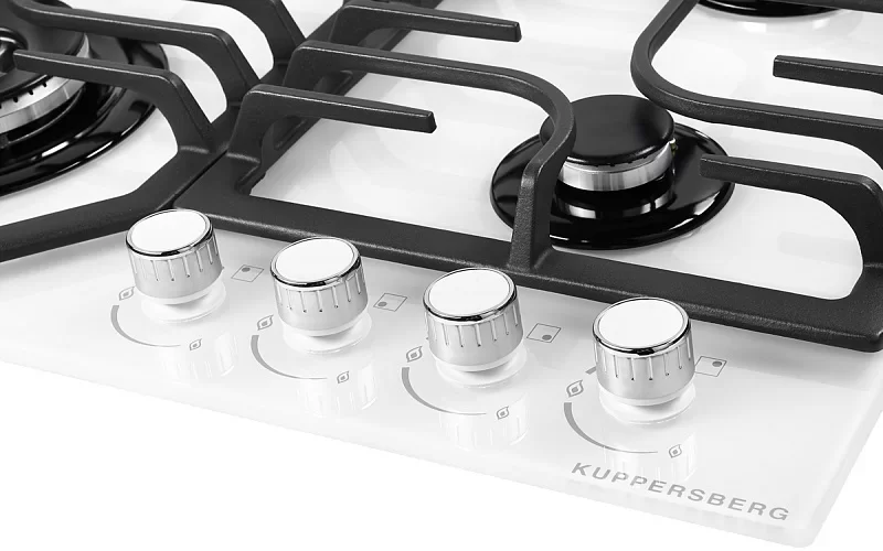 Газовая варочная панель Kuppersberg FG 63 W — встраиваемая модель, выполненная в эстетике стиля Hi-Tech. Необычный и привлекающий внимание дизайн основывается на игре контрастов — поверхность из высокопрочного закаленного стекла изготовлена в кристально-белом цвете, имеет глянцевый блеск, довольно прост в уходе. Конфорки и чугунные решетки, напротив, сделаны в глубоком черном оттенке, а материал имеет матовую, зернистую структуру. В дизайне панели сочетаются круглые формы и четкие прямые линии, благодаря чему появляется ощущение пламени, сдерживаемого в надежной и прочной клетке. Несмотря на оригинальную форму решетки, она сконструирована еще и с учетом практичной точки зрения — вам будет удобно расставлять посуду, при этом огонь не поднимется выше, чем нужно. Поворотные переключатели белого цвета оттеняются светло-серыми элементами и практически сливаются с поверхностью панели. Эффектная и оригинальная модель за счет классической цветовой гаммы будет уместно смотреться в любом интерьере, как в современном, так и в ретро-стиле.