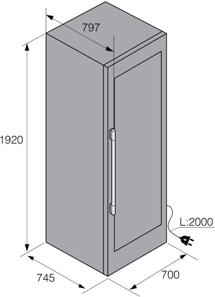 Модель предназначена для хранения до 190 бутылок вина (0,75 л) на деревянных стойках с мягкими телескопическими направляющими. Высококачественное стекло двери с УФ-фильтром защищает напитки от вредных ультрафиолетовых лучей. Для оптического считывания этикеток винных бутылок используется сенсорный дисплей. Он собирает и хранит данные, также предназначен для дальнейшего ведения инвентаря винного климатического шкафа.