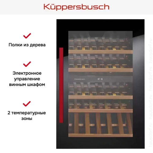 Данная модель Kuppersbusch выполнена в дизайне Hot Chilli — на черном корпусе ярким акцентом стала красная дверная ручка. Благодаря в целом лаконичному внешнему виду этот винный шкаф отлично вписывается в любой интерьер. Необычная деталь — возможность добавить изюминку, не боясь аляповатости.
