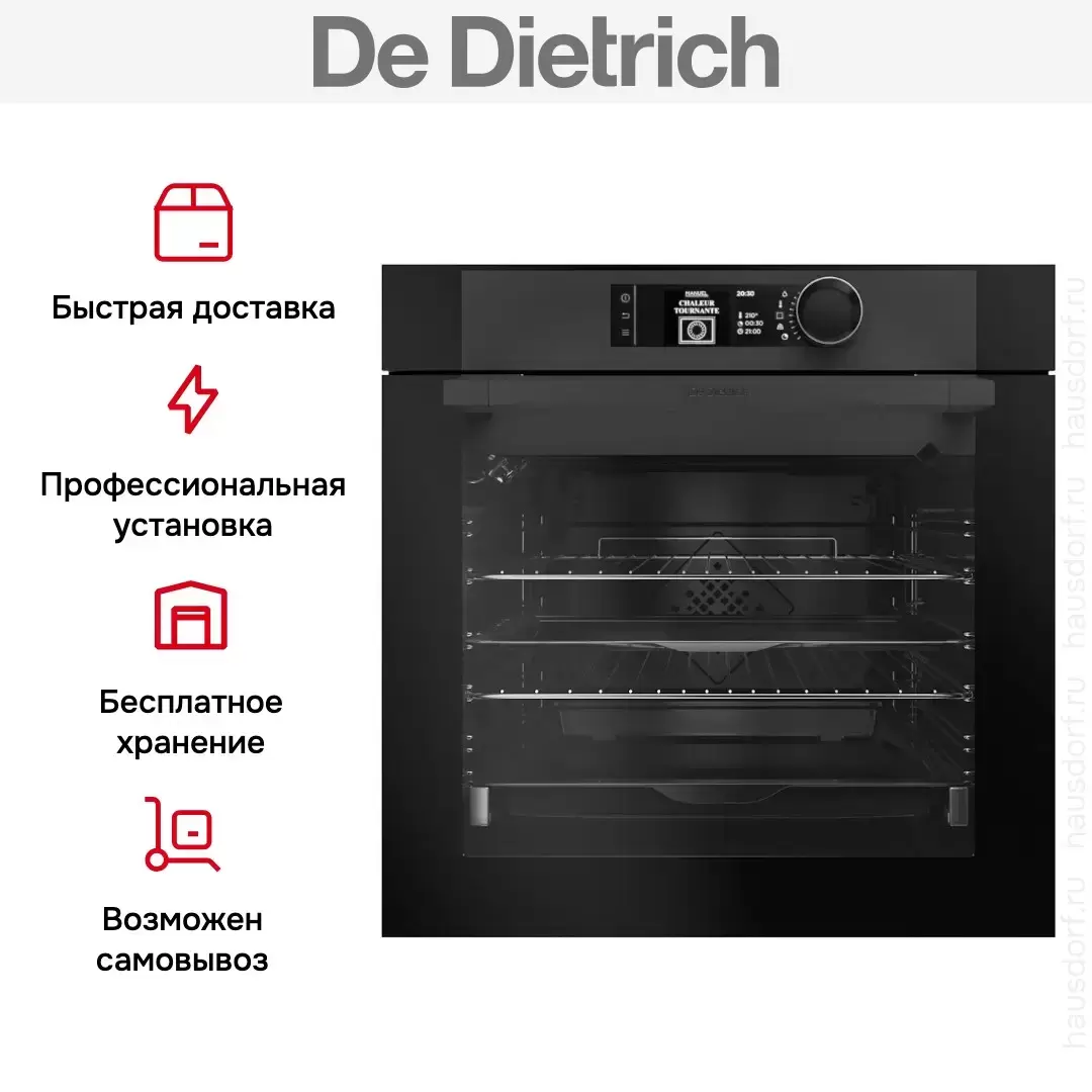 Готовьте свои лучшие блюда и пробуйте новые рецепты с духовым шкафом De Dietrich DOE7560BB! Стандартные размеры и большой объем внутренней камеры — выбор тех, кто много готовит для семьи или частых праздничных встреч с друзьями. Желательно заранее продумать расположение такой модели в кухонном гарнитуре.