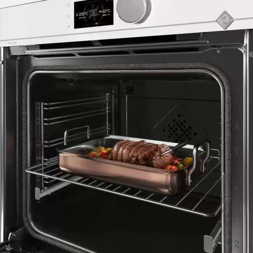 Особенности дизайна и внешней панели управления — также важный пункт при выборе духовки на кухню. В данной модели нужно обратить внимание на цвет — белый, охлаждение двери, чтобы поверхность и мебель вокруг не нагревались.