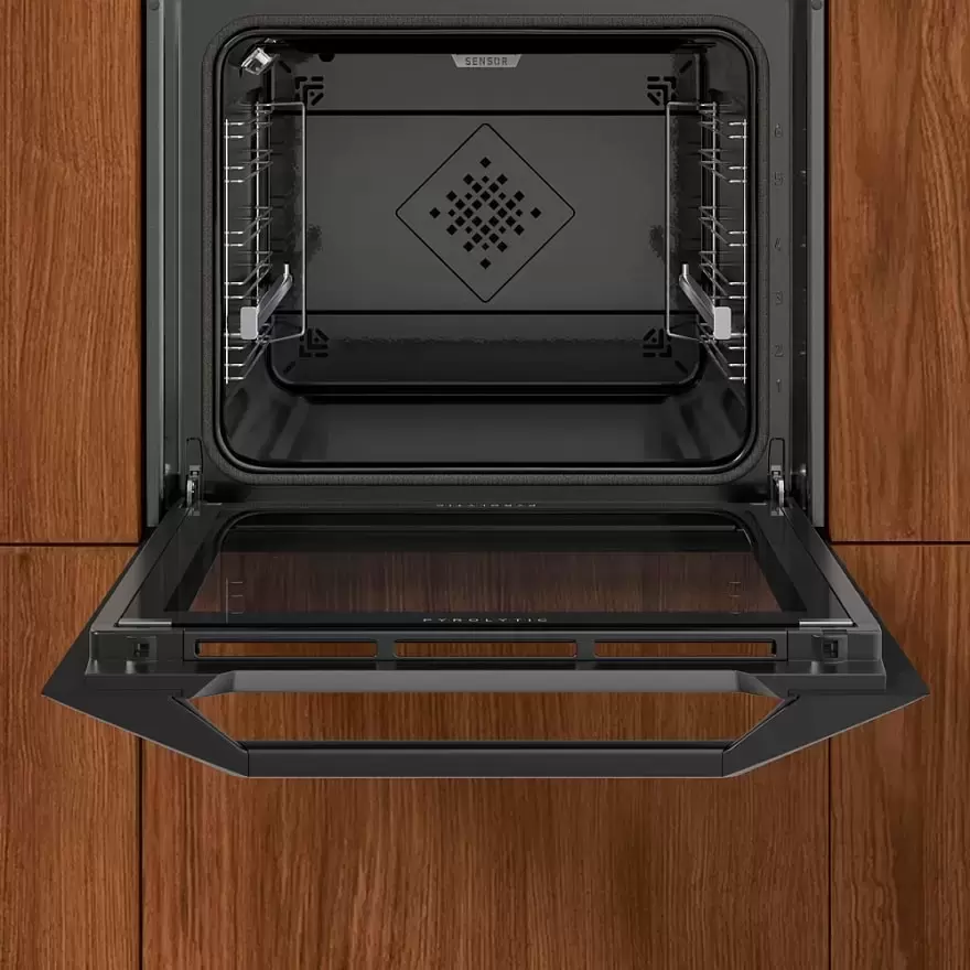 Особенности дизайна и внешней панели управления — также важный пункт при выборе духовки на кухню. В данной модели нужно обратить внимание на цвет — черный, охлаждение двери, чтобы поверхность и мебель вокруг не нагревались.