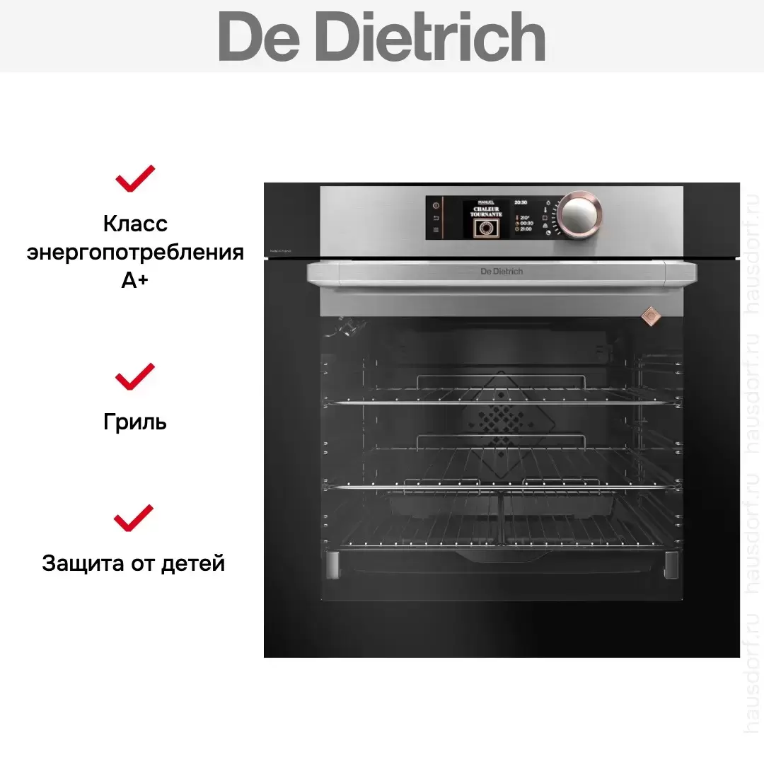 Количество режимов работы в духовом шкафу Де Дитрих: 10. В число доступных программ входят: конвекция, гриль для создания хрустящей корочки, и другие. Тип гриля в этой модели — электрический.