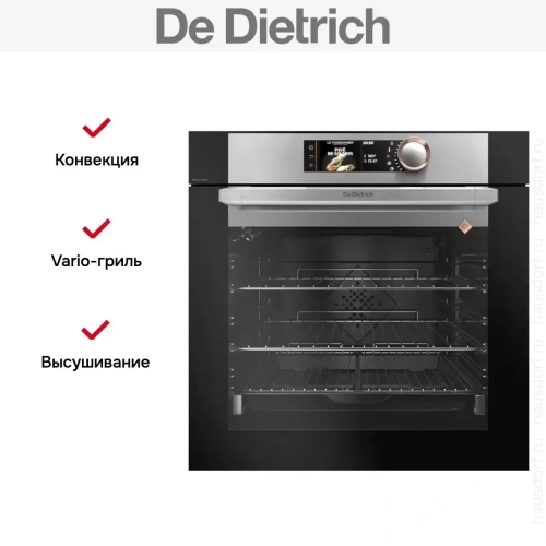 Количество режимов работы в духовом шкафу Де Дитрих: 11. В число доступных программ входят: конвекция, гриль для создания хрустящей корочки, сушка для овощей и фруктов, и другие. Тип гриля в этой модели — электрический.