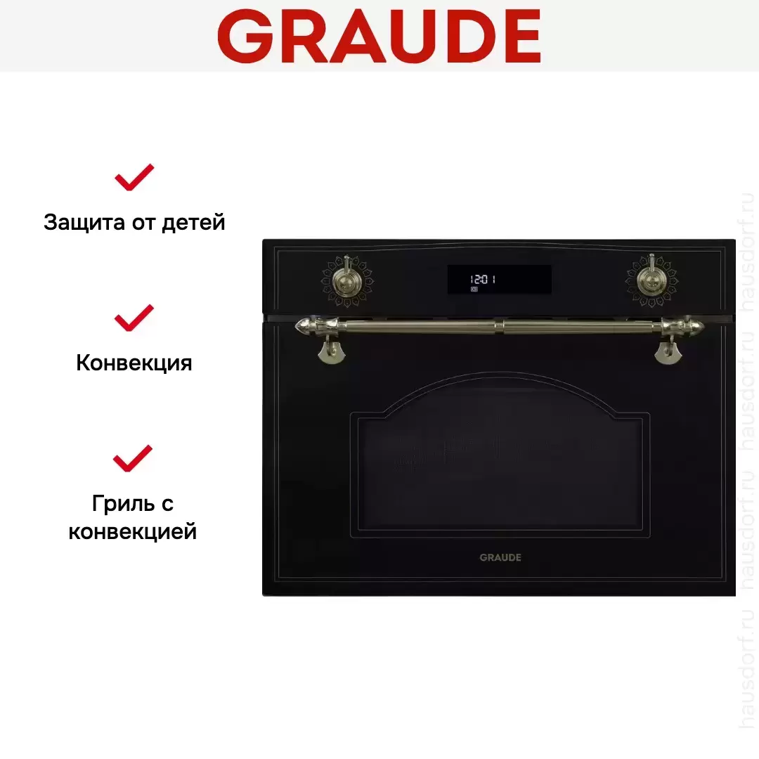 Компактный духовой шкаф Graude BWGK 45.0 S с камерой из нержавеющей стали оснащен встроенной СВЧ, что значительно расширяет его возможности, несмотря на размеры. Прибор черного цвета отлично впишется в кухонное пространство похожего стиля и идеально дополнит остальную технику, ручка и переключатели из латуни расставят необходимые акценты.