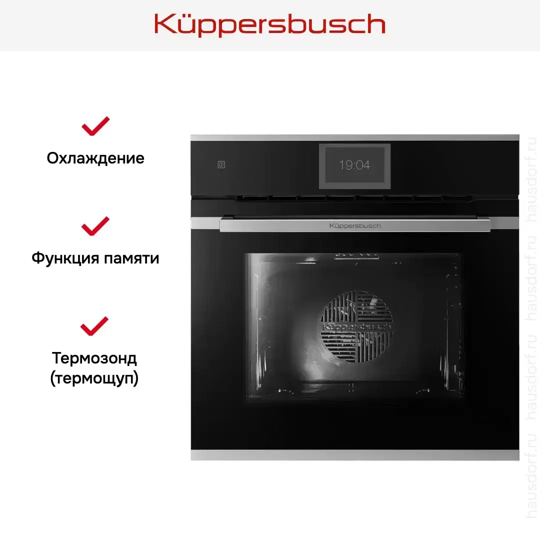 Kuppersbusch B 6850.0 S1 Stainless steel — электрический духовой шкаф шириной 60 см с камерой объемом 70 литров. Фасад выполнен в черном цвете, фурнитура — в контрастном оттенке нержавеющей стали. Духовка оснащена 14 режимами работы, включая гриль большой площади и режим горячего воздуха Ökotherm, 80 автоматическими программами, 11 специальными рецептами, а также функцией сохранения программ в памяти. Покрытие внутренней камеры из öko-эмали легкой очистки и сплошное съемное четырехслойное стекло в дверце облегчают уход за прибором. Панель управления оснащена сенсорными кнопками TouchControl и TFT-дисплеем диагональю 5″ с текстовым и графическим полями.