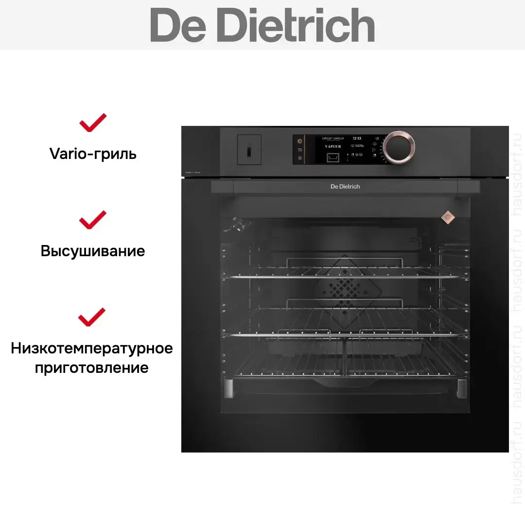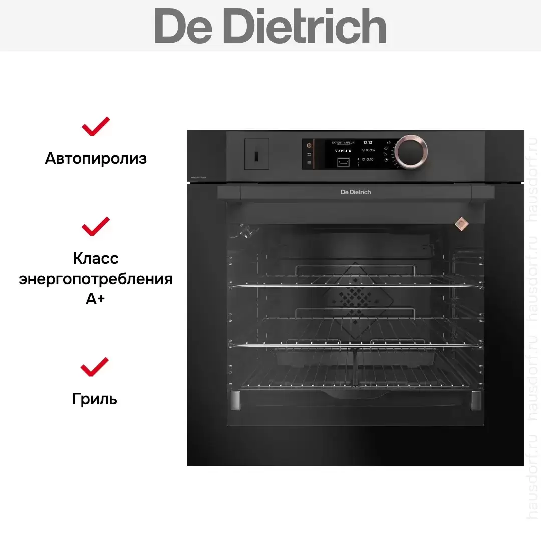 Количество режимов работы в духовом шкафу Де Дитрих: 12. В число доступных программ входят: конвекция, дополнительное использование пара, гриль для создания хрустящей корочки, сушка для овощей и фруктов, и другие. Тип гриля в этой модели — электрический.
