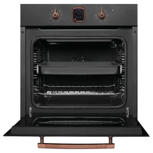 Korting OKB 481 CRCN — полноразмерная встраиваемая электрическая духовка из коллекции Calabria в стиле ретро. Модель представлена в матовом черном цвете с медной фурнитурой и фигурным стеклом в дверце. Стенки камеры объемом 64 литра покрыты изнутри эмалью легкой очистки. Духовка Кортинг OKB 481 CRCN имеет 8 режимов нагрева, в том числе горячий воздух, конвекцию, турбогриль. На механической панели управления находятся поворотные переключатели и аналоговые часы. Духовка оснащена таймером обратного отсчета с автоматическим отключением, термощупом и телескопическими направляющими на 2 уровнях.
