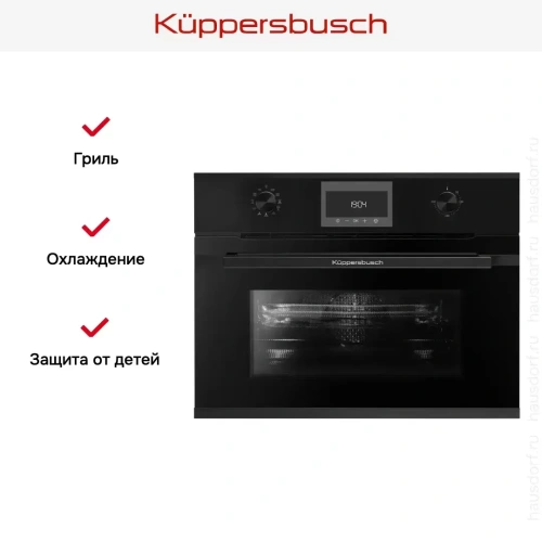 Компактный духовой шкаф с микроволнами Kuppersbusch CBM 6330.0 S5 Black Velvet в черном исполнении может гармонировать с разнообразными интерьерами и цветовыми решениями. Стеклянный фронт отличается практичностью в уходе, так как легко убираются и разводы, и отпечатки от рук. Удобное управление при помощи поворотных ручек и сенсорных кнопок будет понятно людям любого возраста. Все текущие настройки демонстрируются на большом дисплее. Комбинированный прибор не только экономит место, но и позволяет заменить два устройства одним. Режим микроволн имеет 10 ступеней мощности, а духовкой шкаф Купперсбуш CBM 6330.0 S5 восемь режимов нагрева и 10 автоматических программ.