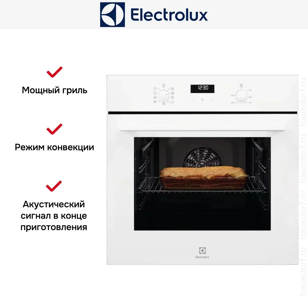 Духовой шкаф Electrolux EOF5F50BV — независимая электрическая модель для встраивания с лаконичным белым корпусом и аккуратной фурнитурой. Ее внешний вид выдержан в светлой гамме, поэтому прибор легко впишется как в классическую кухню, так и в современные интерьеры в духе минимализма или хай-тек. Четко указанные в документации размеры ниши для встраивания позволяют точно спланировать установку в кухонный модуль.
