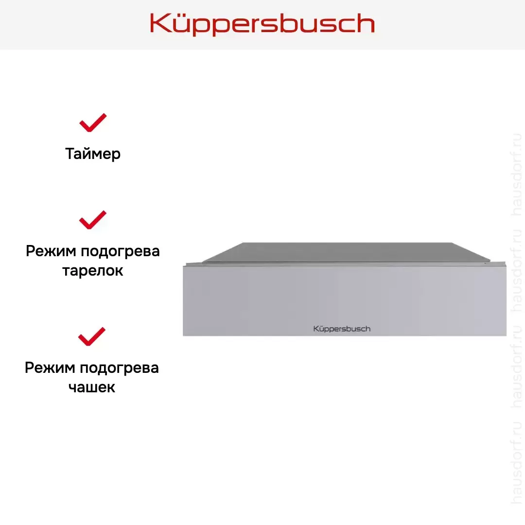 Kuppersbusch CSW 6800.0 G — встраиваемый электрический подогреватель посуды со сплошным фасадом из закаленного стекла элегантного серого цвета. Для открывания ящика достаточно нажать на фронтальную часть изделия. Высота 14 см и ширина камеры 60 см позволяют без труда поместить туда набор столовых приборов на 6 персон, или 20 тарелок диаметром 28 см, или 80 чашек эспрессо, или 40 чашек капучино. Сенсорные кнопки и дисплей позволяют плавно регулировать температуру в пределах от 30 до 80 °С. Прибор позволяет также расстаивать дрожжевое тесто, подогревать готовые блюда, размораживать продукты и готовить при низкой температуре. Модель оснащена таймером с режимом отложенного старта.